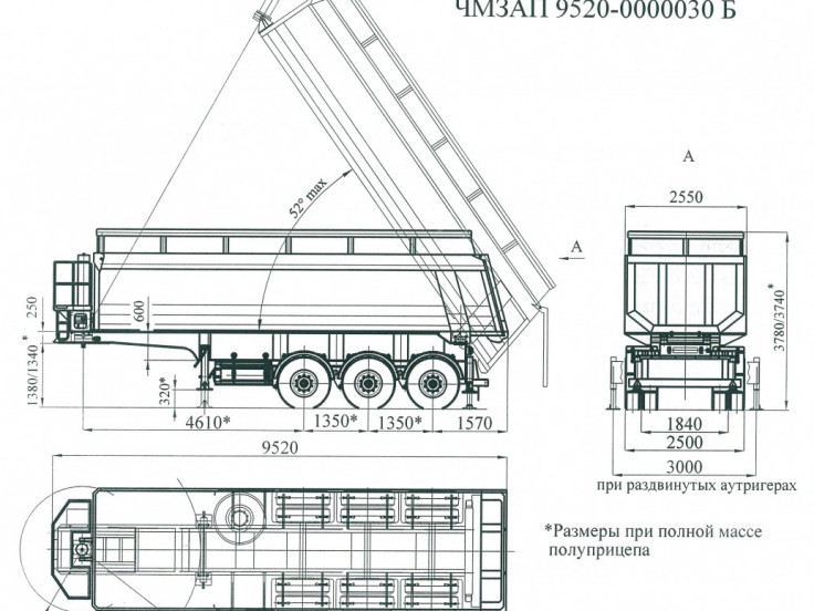 Полуприцеп-самосвал ЧМЗАП 9520 по спецификации 030 Б является трехосевым, применяется для транспортировки преимущественно габаритных и сыпучих грузов. Базовая масса снаряженного прицепа составляет 12 тонн, а максимальная грузовая нагрузка составляет 41 тонну.