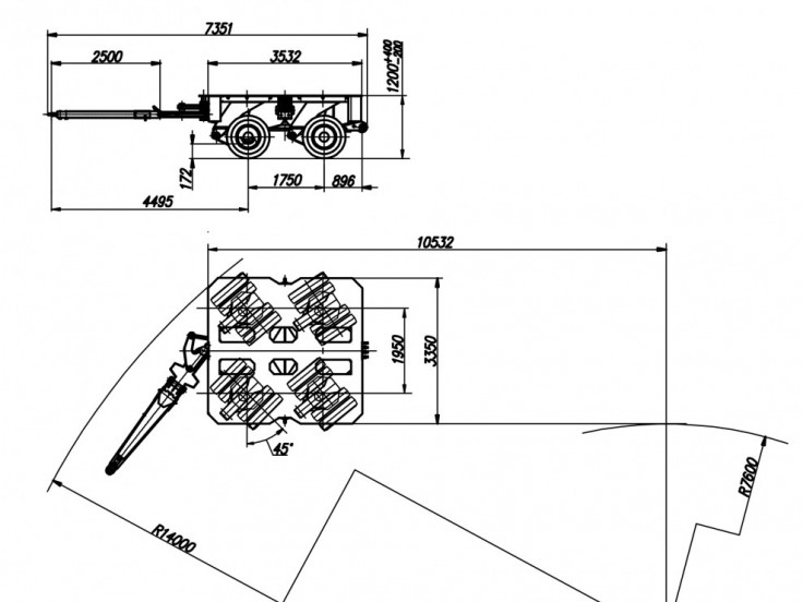 Полная длина прицепа составляет 10,5 м. Из них 7,3 м приходятся на длину модуля. Буксирный прибор располагается на уровне 0,8 м. Все характеристики целиком совпадают с российским регламентом о безопасности транспорта.